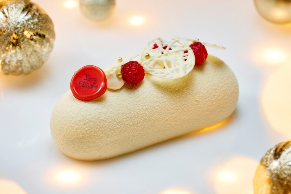 今年のテーマカラー「RED」を象徴する、鮮やかなレッドのキルティング紋様が目を引くブッシュドノエル。ムースのベースには、パティシエが自家製で作り上げたエクアドル産カカオバターを使用したホワイトチョコレートムースを採用。自家製ならではの独特な風味と、センターに閉じ込めたピスタチオクリーム、いちご・ラズベリーのジュレが織りなす、赤と白のコントラストが際立つケーキです。