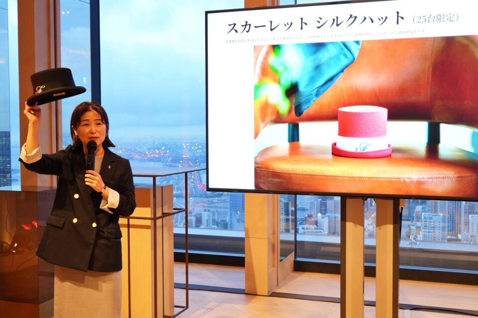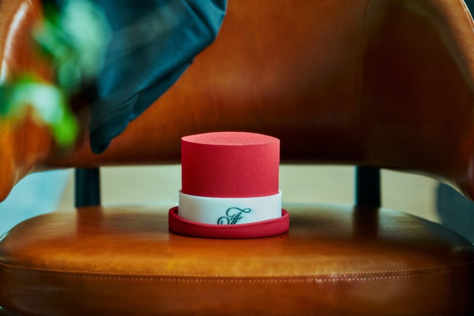 ホテル初登場を飾るにふさわしい、「私たちの初めまして」の想いを込めて、ホテルにゲストを最初にお迎えするベルチームのシルクハットから着想を得たエレガントで芸術的なケーキ。