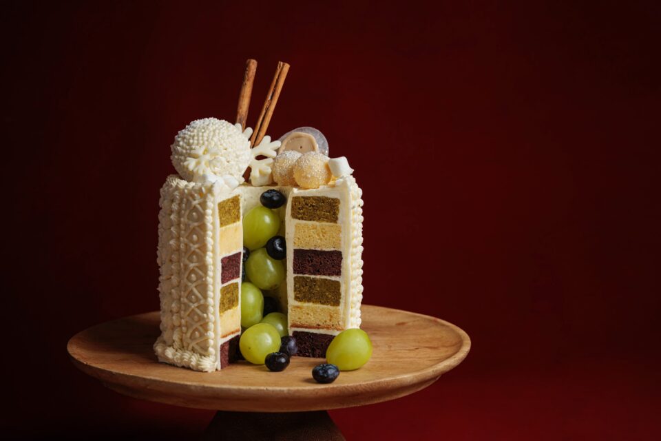土台はドーナツ型のココアとベリーのレッドベルベットケーキから始まり、その上にピスタチオケーキ、さらにレモンや柚子(ゆず)のシトラスケーキをトンカ豆風味のクリームでサンドして積み上げています。中心の空洞には、シャインマスカットとブルーベリーが丸ごと詰め込まれており、カットした瞬間のサプライズもお楽しみいただけます。