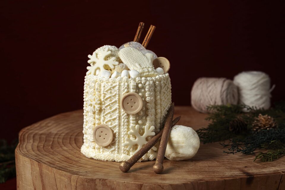 周りのデコレーションは、バタークリームで繊細に絞り出したニットの網目模様。トップには、チョコレートで作られたミトンやボタン、雪の結晶が飾られ、大切な人への贈り物であるニットをデザイン。多層的な味わいと、職人技が光る物語性豊かなテクスチャーが融合した、他に類を見ない一品です。