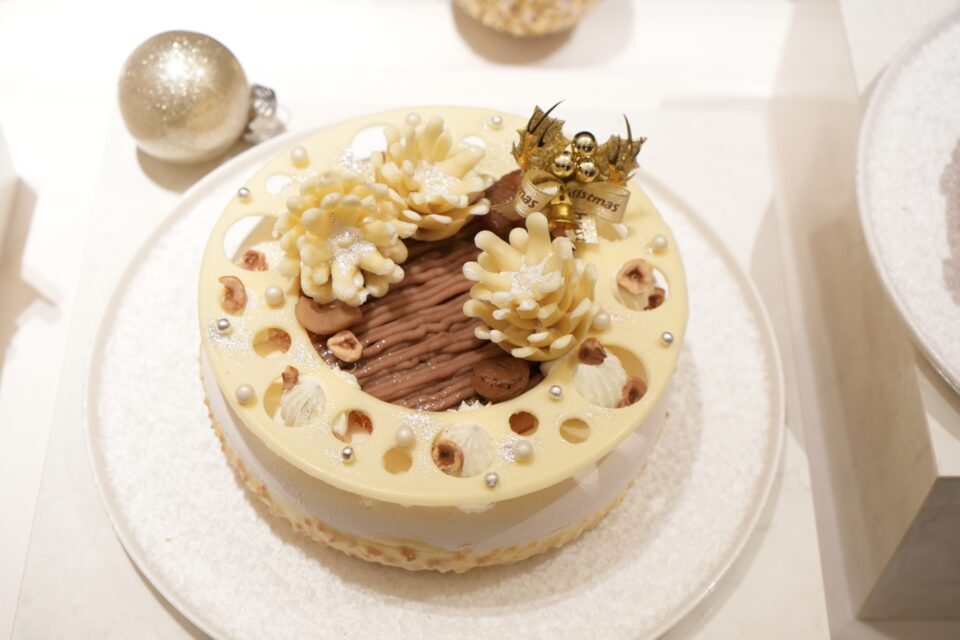 濃厚なダブルクリームの風味を活かしつつ、ベルガモットの爽やかな香りが重さを打ち消し、重すぎない口当たりを実現しています。トップには雪の結晶を思わせるホワイトチョコレートと松ぼっくり型のチョコレートが飾られ、リースのように可憐で華やかな、大人向けの味わいに仕上げられています。
