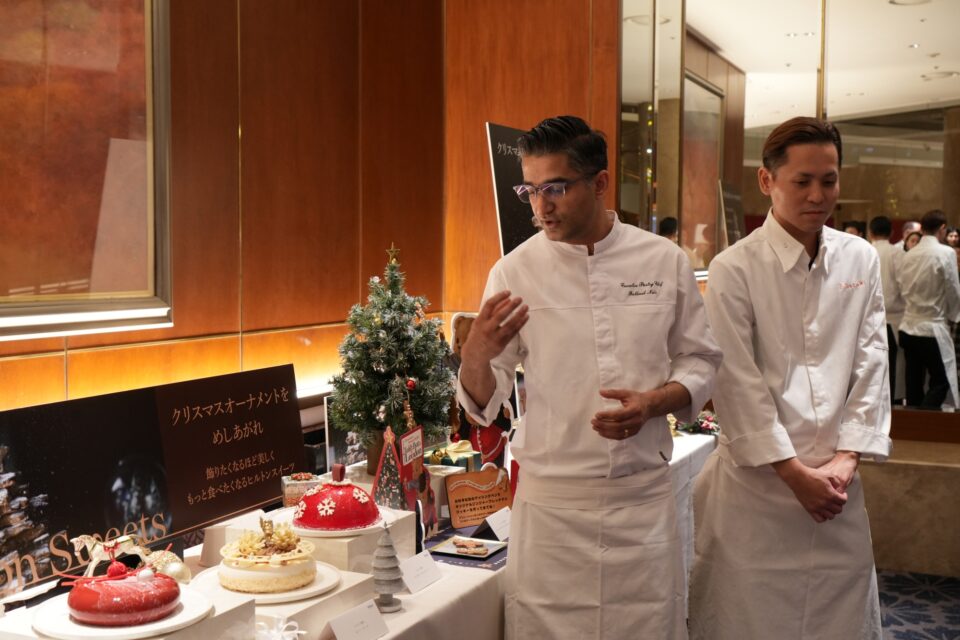 エグゼクティブ・ペストリーシェフのラティーシュ・ナイヤー氏が紹介したのは、クリスマスケーキ「スノー・リース」と、スイーツビュッフェで提供される「ロイヤル・オーナメント」。
