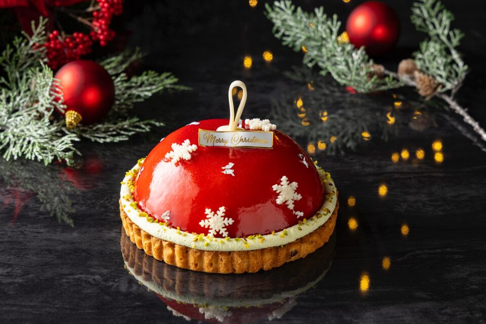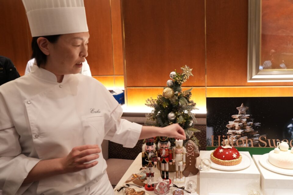 ヒルトン小田原 ペストリーシェフ柏木 英里子氏が紹介したのは、ファミリー層の多いリゾートホテルならではの、何世代でも楽しめる華やかさを追求したクリスマスのタルトを提供。