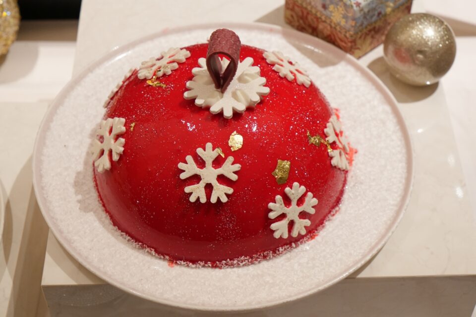 ヒルトン東京1階「マーブルラウンジ」のスイーツビュッフェ『King & Queenのクリスマス』に登場する「ロイヤル・オーナメント」は、クリスマスツリーを彩る主役級の存在感を放つ、深紅のドーム型ケーキです。このケーキは、見た目の華やかさだけでなく、素材の風味とフレンチスタイルの洗練された味わいが際立ちます。