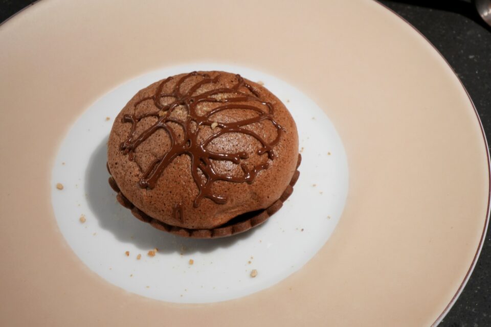 ショコラとマロンの季節の香りが立ち上るスフレは、口に入れた途端に淡雪のように儚く溶ける口溶けが魅力。温かいスフレのテクスチャーと、濃厚なマロンの風味、そしてカカオの重厚なアロマが融合し、まさに至福の瞬間をもたらします。