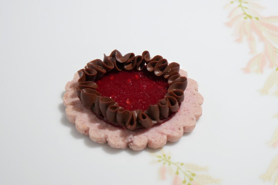 サクサクとしたビスキュイの周囲には、ガナッシュが芸術的に絞られ、中心にはフランボワーズの鮮烈なコンフィチュールが。カカオの重厚な風味の中に、フランボワーズの溌剌とした酸味が鮮烈なアクセントを加えることで、味わいのコントラストを強調した、軽やかで華のある一品です。