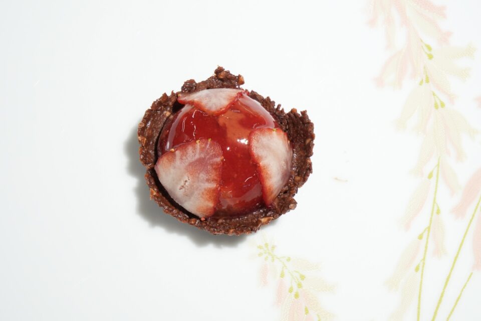 苺(フレーズ)とショコラのクラシックな出会いを、ドーム型の優美なフォルムで閉じ込めた、ホリデーの色彩を象徴する一品。 食感の三重奏が織りなす精緻なハーモニー。香ばしさが際立つサクサクとしたテクスチャーで力強く土台を築き上げます。その上のショコラムースは、カカオの奥深いコクを保ちながらも、舌の上で淡雪のように儚く消え去る軽い質感を実現。そして、トップの鮮やかな苺のジュレが、瑞々しい酸味と果実味をもってショコラの重厚感を軽やかに引き上げる役割を果たします。ヘーゼルナッツ入りのクルスティヤンの香ばしさ、ムースの軽やかさ、ジュレの瑞々しさが三位一体となり、華やかな色彩と味わいを演出。