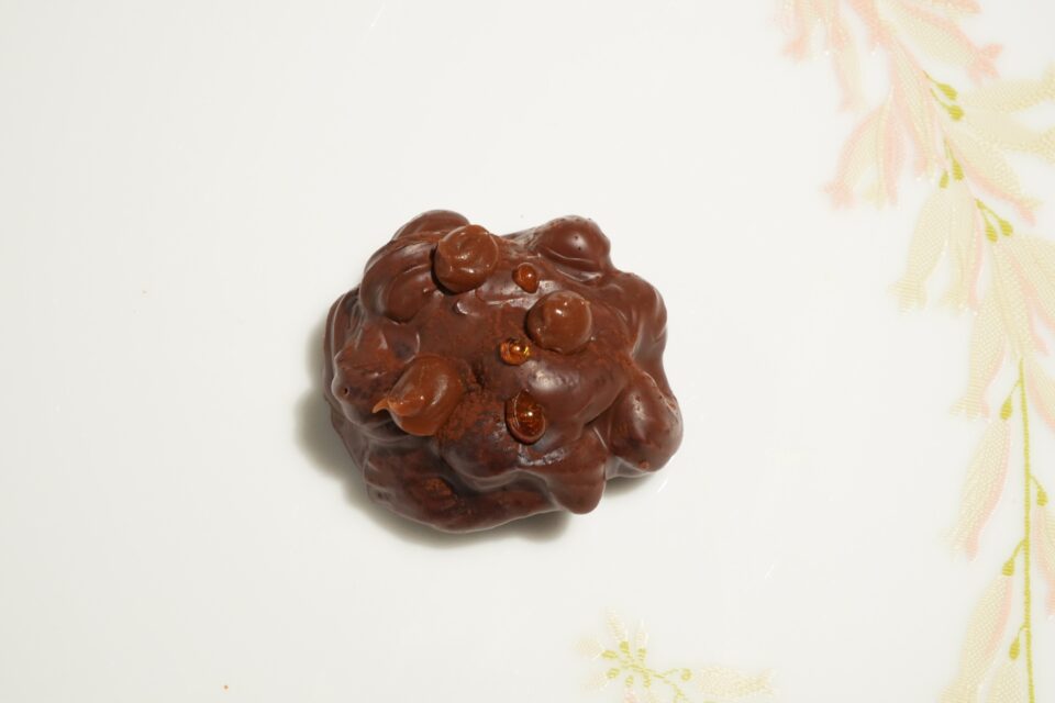今回のル・グテ・ド・ノエルで日本初登場となる、注目度の高いクリエイション。立体的な造形の中に、デュカス氏の哲学が息づきます。濃厚なガナッシュと塩キャラメルが織りなす「塩味と甘味のコントラスト」が鍵。カカオの深みと、焦がしキャラメルのほろ苦くまろやかな風味が溶け合い、一粒で満足感のある、重厚かつ複雑なアロマを放ちます。