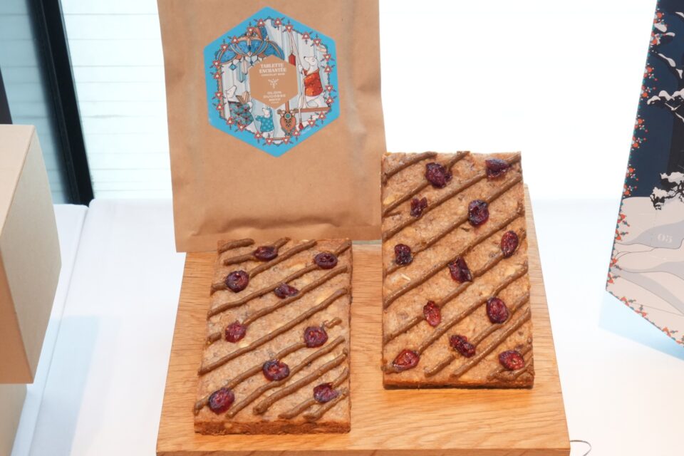 ブランドの象徴であるタブレットショコラからインスパイアされて作られた、クリスマス限定のタブレット・ビスキュイ(焼き菓子)です。単なるビスケットではなく、テクスチャーの対比を極めた一品。ビスキュイ生地には、オレンジやグレープフルーツのコンフィと砕いたアーモンドがたっぷりと混ぜ込まれており、焼成されたコンフィの複雑なアロマとしっとりとした食感を生み出しています。