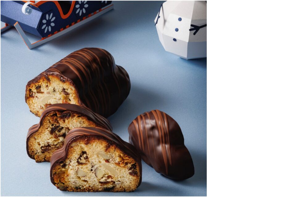 最大の特長は、コルシカ島ソヴェリア村で昔ながらの製法で手作りされたオレンジとレモンのコンフィをたっぷりと混ぜ込んでいる点。この希少なコンフィの生き生きとしたアロマが、香ばしいアーモンドの風味と融合します。仕上げに、カカオ75%と45%のショコラで巧みにコーティングすることで、重厚なスパイスの香りに、繊細でビターなカカオの余韻という、ショコラ専門店ならではの奥行きを与えています。時間が経つごとに熟成する味わいの変化も、この上質なシュトーレンの醍醐味です。