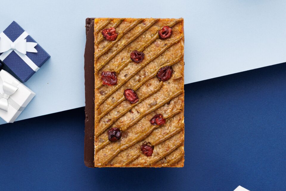 その片面をカカオ75%のビターショコラで大胆にコーティング。軽快なビスキュイの歯切れと、重厚なカカオの口溶けが対比をなし、トップのピスタチオプラリネとドライクランベリーが、味わいの立体感とホリデーらしい華やかな色彩を添えます。