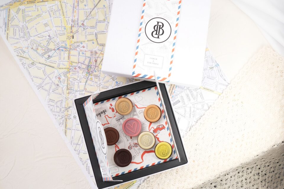 ベルトラン・バレーの『アソルティマン クール・ア・ルーヴラージュ』。レターセットのような美しいBOXを開ければ、パリのレッドベリーやリヨンのマロンなど、シェフが愛したフランス7地域の記憶が、一篇の手紙のように綴られている。