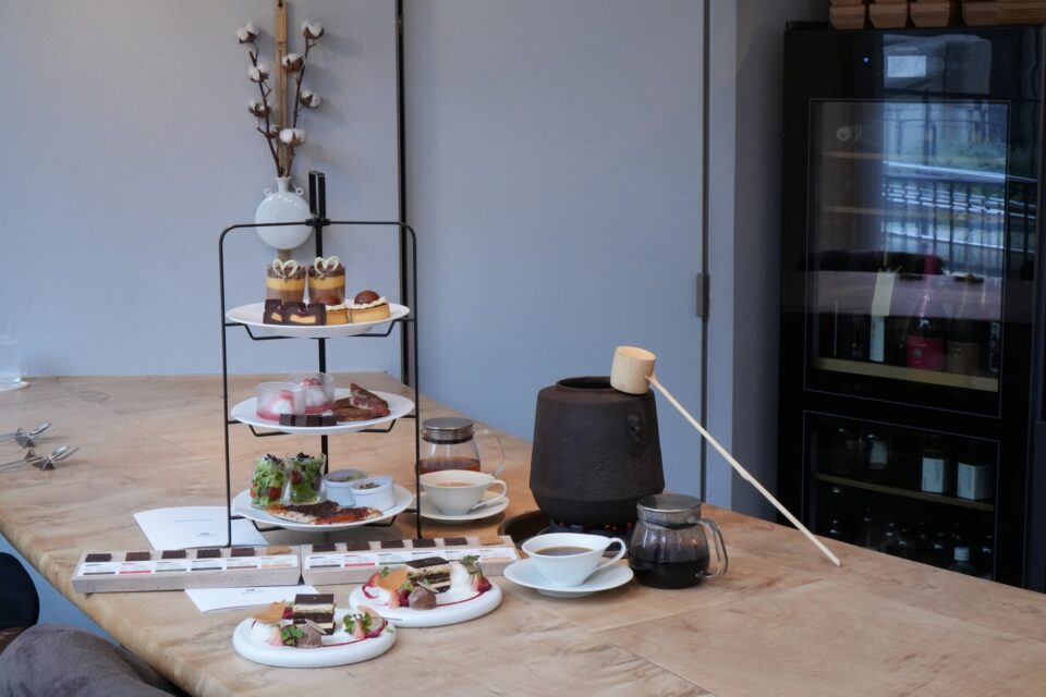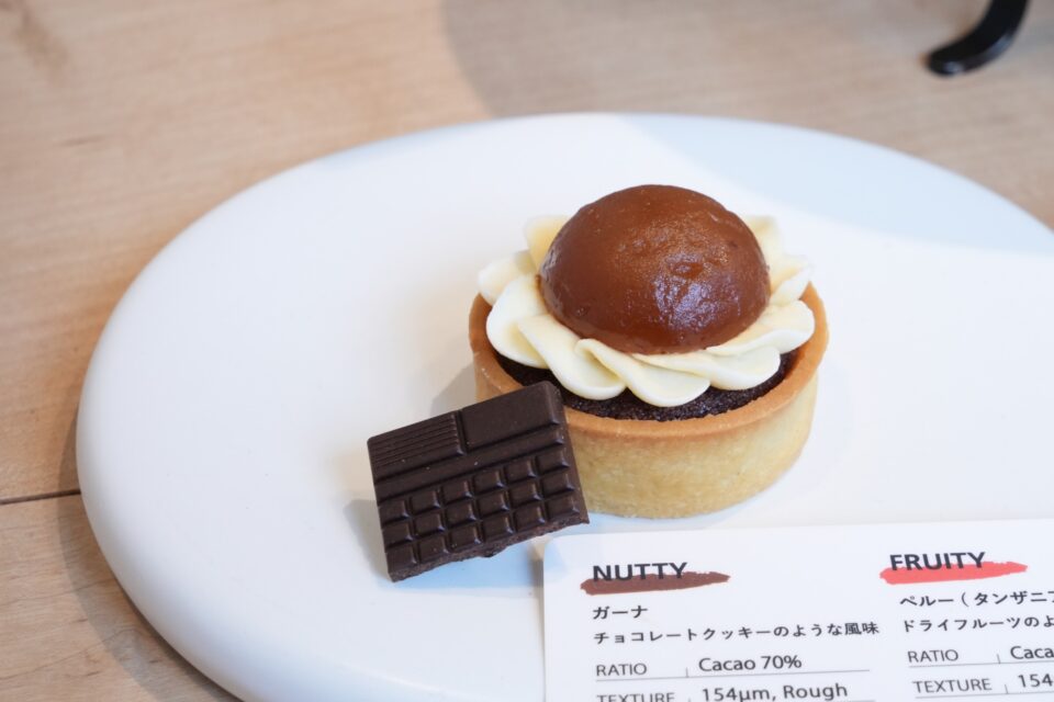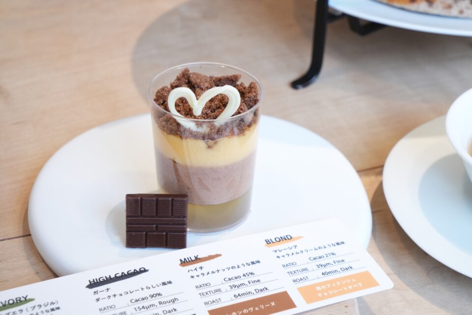 繊細なホワイトティーが素材の瑞々しさを引き立て、徐々にカカオのテクスチャーが強いものへと移りながら、最後はカフェ(コーヒー)とともに深いカカオの余韻に浸る。