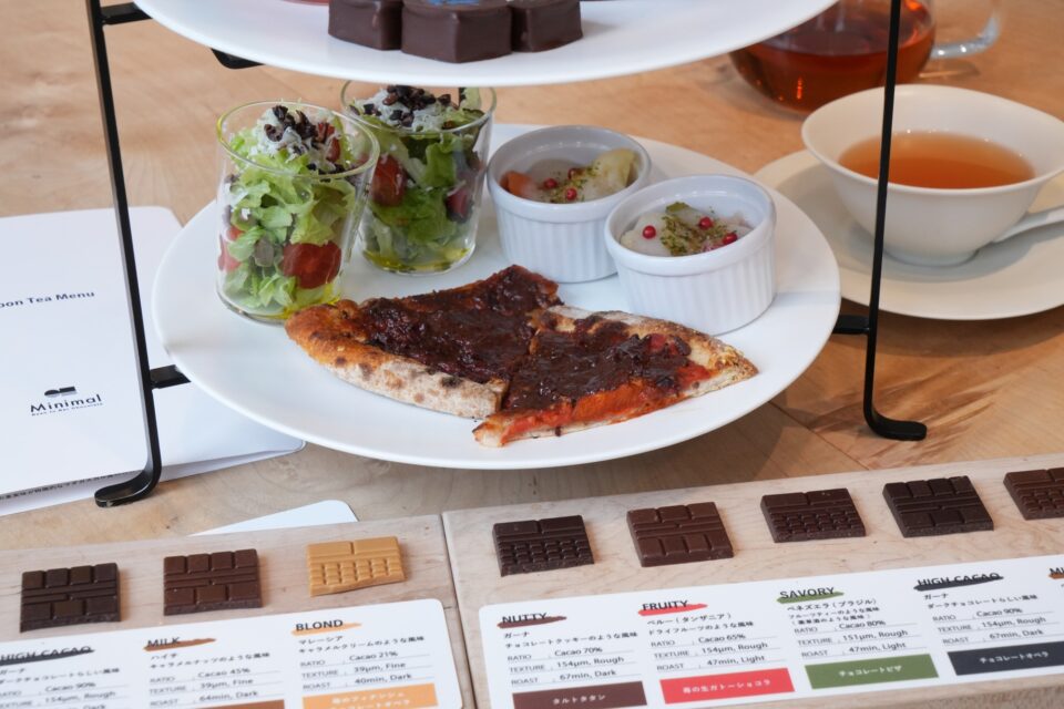 提唱するのは、カカオ豆が持つ「果実としての表情」を剥き出しにする引き算の哲学。原材料は、世界10%以下のファインカカオと砂糖のみ。その純粋な思想を、コース仕立てのように多角的に体験できるのが、麻布台ヒルズ店限定の「Minimal チョコレートアフタヌーンティー vol.9」です。