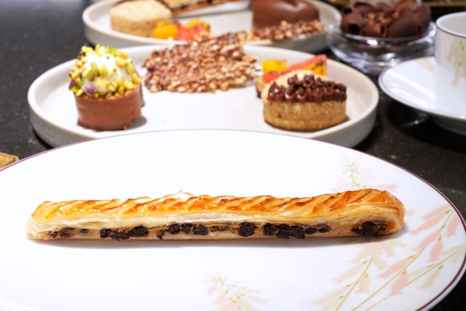 フランス・イズニー産の上質な発酵バターをたっぷり使い、緻密に折り重なったサクサクの生地。その中には、ヘーゼルナッツの香ばしいカスタードクリームと、アラン・デュカスオリジナルブレンドのショコラが贅沢に挟み込まれています。一口噛み締めるたびに、職人の手仕事による生地の層が弾け、熱を帯びてとろけ出すショコラの芳醇なアロマが鼻腔を支配する、まさに至福の瞬間です。