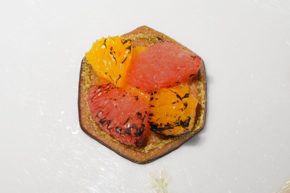 フランス産バターの芳醇な香りが広がる「ル・ビスキュイ・アラン・デュカス」の人気商品「ピュール・ブール」をオレンジ風味に焼き上げ、片面をショコラでコーティング。その上に、瑞々しいオレンジとグレープフルーツを冠した一品です。