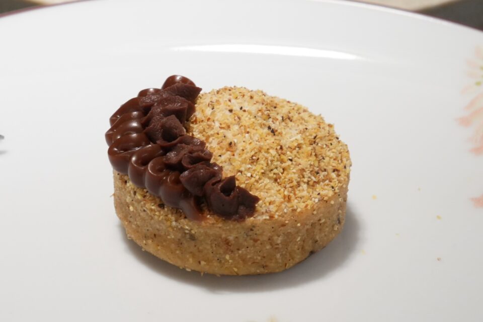 『余分な水分を飛ばして甘みを凝縮させ、色味を整えるだけでなく、キャラメリゼに近い微かな苦味を加える』というパトリックシェフの意図が、ビスキュイのバター感とショコラの風味を鮮やかに繋いでいます。