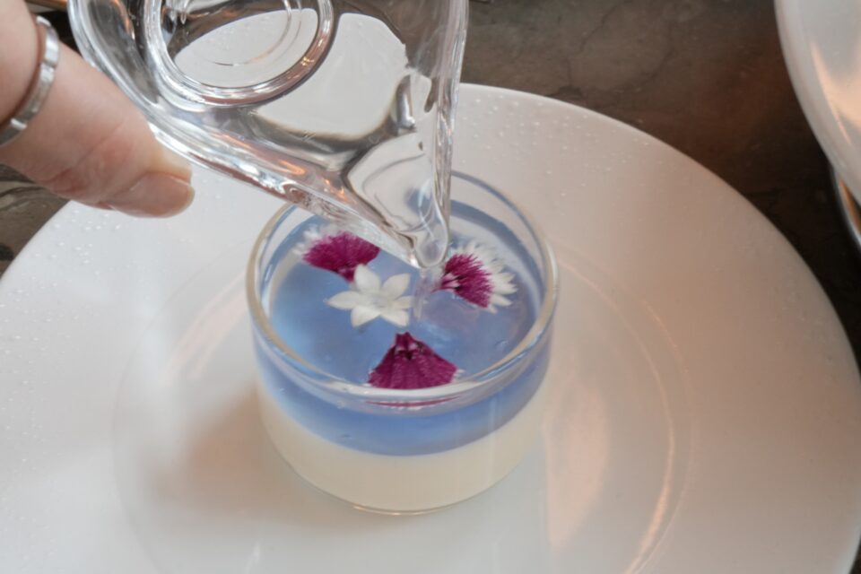 まず、視覚的なクライマックスを演出する鮮やかな青の「ココナッツブランマンジェ バタフライピージュレ」。別添えの透明なソースをかけると、バタフライピーが反応し、ゆっくりとピンク色に染まっていく。