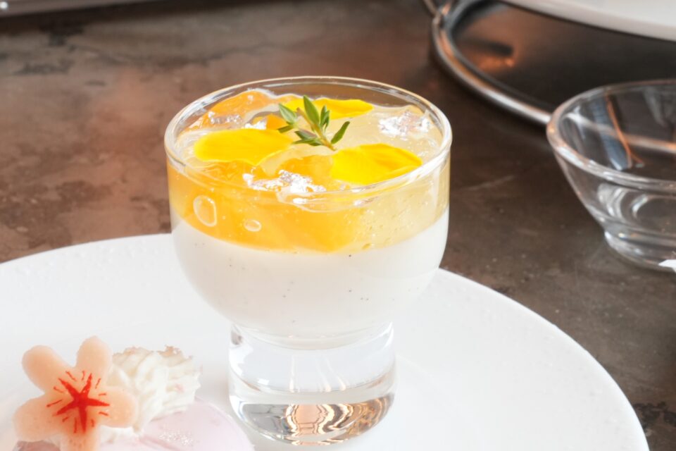 下のココナッツブランマンジェの重厚感。軽やかなトップのジュレに対し、しっかりとしたボディを持たせることで、一皿の中での重量バランスを完璧に整えています。