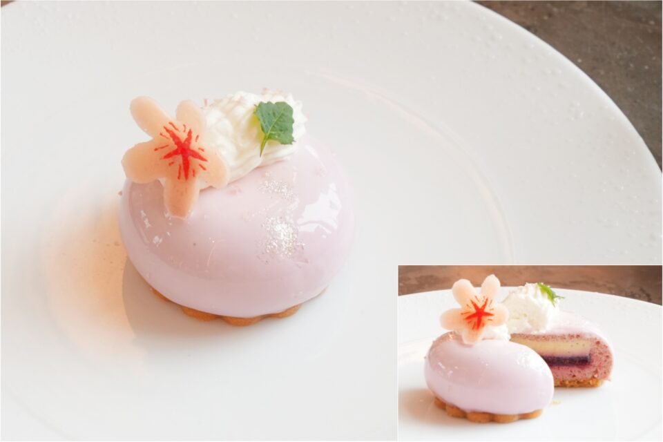 <スイーツ>パンナコッタ エルダーフラワージュレ、グレープフルーツタルト、ラズベリーローズロールケーキ、桜とルビーチョコレートムース、ココナッツブランマンジェ バタフライピージュレ、ラベンダーとホワイトチョコレートのタルト